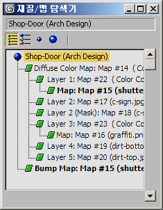탐색기에는 활성 샘플 슬롯에 있는 재질과 맵이 표시됩니다. 탐색기에 나열된 재질이나 맵을 클릭하여 현재 재질의 계층을 탐색할 수 있습니다. 반대로 재질 편집기에서 재질을 탐색할 때는 현재 수준이 탐색기에 강조 표시됩니다. 선택한 재질이나 맵이 샘플 슬롯에 활성화되고 선택한 재질이나 맵에 대한 롤아웃이 아래에 표시됩니다.