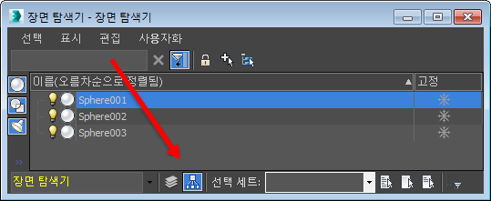 장면 탐색기에서 선택 도구 모음의 버튼을 사용하여 두 개의 서로 다른 정렬 모드 간에 전환할 수 있습니다.