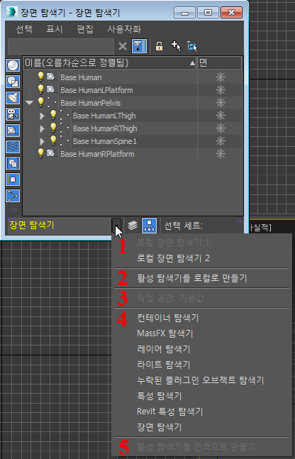 - 로컬 장면 탐색기를 전역으로 설정할 때 저장한 장면 탐색기와 같이 해당 파일에 정의된 모든 전역 장면 탐색기 리스트입니다. 그림에서는 3ds Max와 함께 설치되는 기본 전역 장면 탐색기를 보여 줍니다.