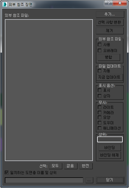 외부 참조 장면 대화상자에서는 외부 참조 장면을 추가 및 제거할 수 있습니다. 또한 외부 참조 장면을 배율 조정, 회전 또는 이동할 수 있도록 외부 참조 장면 표시를 제어할 수 있는 도구, 장면의 다양한 구성요소를 무시하는 옵션 및 상위 오브젝트를 바인딩하는 기능을 제공합니다.