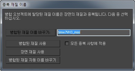 버튼을 사용하기 전에 이 옵션을 설정하면 중복된 이름을 갖는 이후에 들어오는 모든 재질이 현재 재질과 같은 방식으로 취급되며 더 이상 경고 메시지가 표시되지 않습니다.