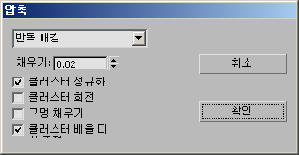 압축 대화상자에는 UVW 편집 대화상자 창에서 절차에 따라 텍스처 클러스터를 다시 정렬하기 위한 컨트롤이 포함되어 있습니다.