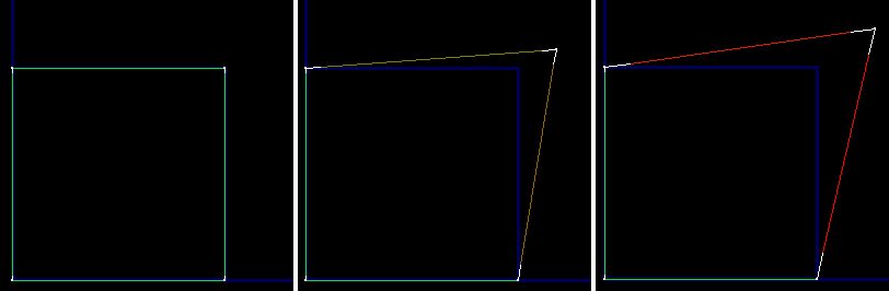 초록색-빨간색 색상 범위를 사용하여 왜곡(텍스처 가장자리가 해당 형상 가장자리에서 떨어진 거리)을 표시합니다. 길이 차이가 클수록(즉, 왜곡이 클수록) UVW 편집 대화상자 창에서 가장자리가 더 빨갛게 표시됩니다. 또한 너무 긴 가장자리의 끝 세그먼트는 흰색으로 그려져 형상 가장자리 길이와의 차이를 표시합니다.