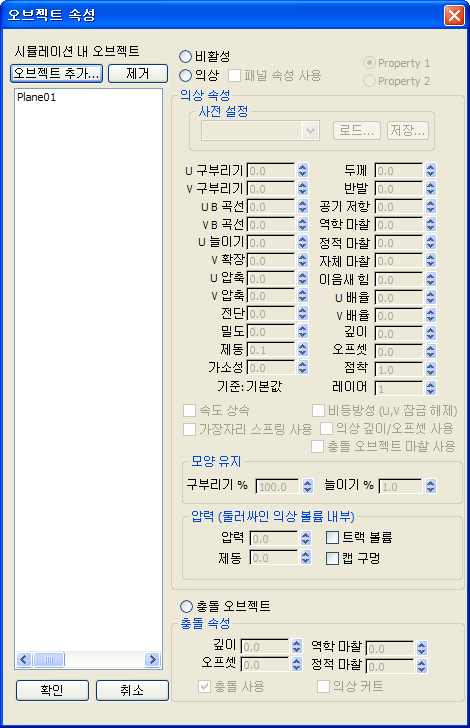 오브젝트 특성 대화상자를 사용하여 의상 또는 충돌 오브젝트인지 의상 시뮬레이션에 포함할 오브젝트를 지정하고 해당 오브젝트와 연관된 매개변수를 정의합니다.