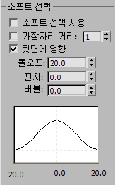 소프트 선택 컨트롤은 그룹별로 적용되어 명시적으로 선택된 그룹 구성원에 인접한 정점의 소프트 선택을 허용하며 3ds Max의 다른 부분에서는 정점의 소프트 선택과 동일한 방식으로 작동합니다. 자세한 내용은 소프트 선택 롤아웃을 참조하십시오. 또는 텍스처 맵을 기준으로 그룹의 정점을 선택할 수 있습니다.