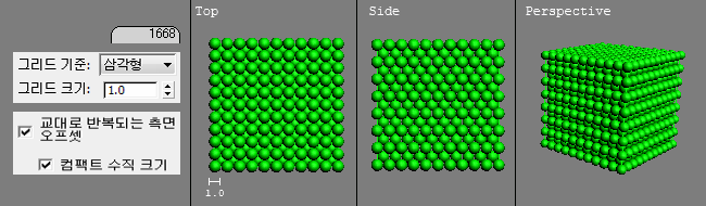 - 단일 그리드 레이어에서 사각형 또는 삼각형 레이아웃으로 파티클을 압축하는 방법을 선택합니다. 두 가지 선택 사항은 다음 그림의 위에서 보이는 대로 표시됩니다.