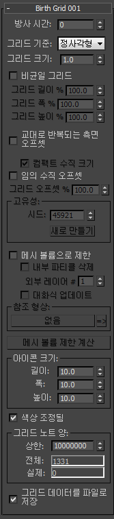 - Birth 그리드는 특정 순서(일반적으로 아래에서 위로)로 아이콘을 채우므로 그리드가 꽉 차지 않은 경우(즉, 비균일 그리드 치수를 줄인 경우) 파티클이 일반적으로 볼륨의 동일한 부분에서 누락되므로 상한 설정을 늘려 채워야 합니다.