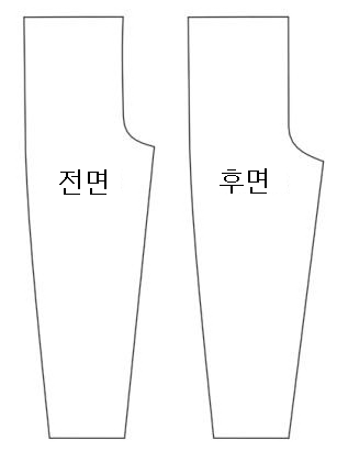 바지 패턴의 위쪽에는 힙을 위한 곡선 모양이 있습니다. 외부 이음새의 직선 가장자리가 길수록 내부 이음새의 가장자리가 짧습니다. 위쪽의 곡선이 배 또는 엉덩이 둘레와 가랑이 영역 아래에 맞게 조정됩니다.