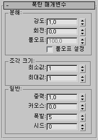 - 폭발에 임의의 변형을 추가하여 덜 균일하게 합니다. 0.0 의 설정은 완전히 균일합니다. 1.0 은 현실적인 설정 입니다. 1.0 보다 더 큰 값은 폭발을 여분의 혼돈으로 만듭니다. 범위는 0.0에서 10.0 사이입니다.