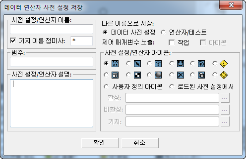 이 대화상자를 사용하여 데이터 연산자 또는 테스트를 사전 설정 또는 연산자로 저장합니다. 후자의 경우 3ds Max를 종료하고 다시 시작하면 파티클 뷰 기지에 표시됩니다.