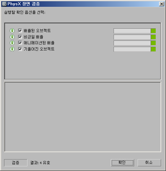 대화상자에서 확인 테스트를 수행하여 MassFX 장면이 오류 없이 올바르게 내보내졌는지 확인합니다. 확인 옵션은 다음과 같습니다.