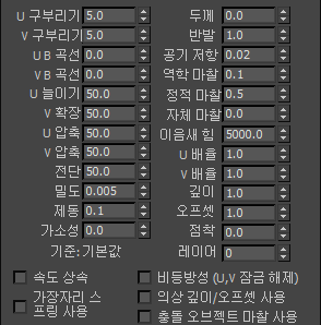 오른쪽: U 및 V 구부리기=2.5, 비단 또는 기타 경량 직물 시뮬레이션