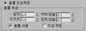 충돌 오브젝트의 충돌 깊이입니다. 옷감의 일부가 충돌 오브젝트 내에서 이 깊이에 도달하면 시뮬레이션에서 옷감을 더 이상 메시 바깥으로 밀어내지 않습니다. 이 값은 3ds Max 단위로 측정됩니다.