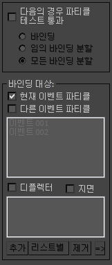 이 그룹의 설정을 사용하여 파티클이 바인딩할 수 있는 다른 시뮬레이션 엔티티를 지정할 수 있습니다. 현재 이벤트의 파티클, 다른 이벤트의 파티클, 디플렉터, 지면 또는 이러한 엔티티의 모든 조합이 될 수 있습니다.