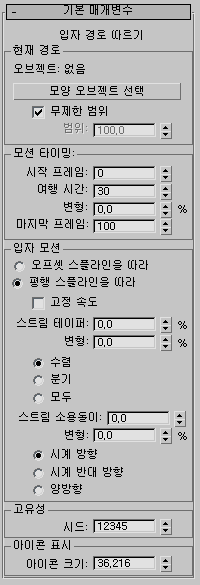 다음 컨트롤은 경로 흐름이 파티클에 영향을 미치는 기간을 결정합니다.