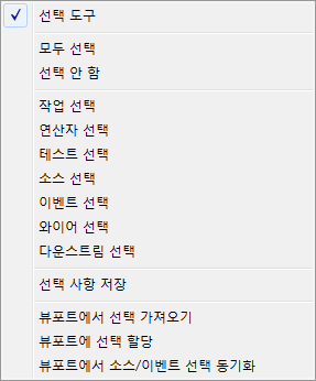 기본적으로 선택 도구는 파티클 뷰가 열려 있을 때 활성화되며, 화살표 모양의 마우스 커서로 표시됩니다. 이 도구를 사용하여 이벤트, 동작, 도구 및 와이어를 강조 표시하고 이동하며 복사할 수 있습니다. 또한 이 메뉴의 명령을 사용하여 모든 요소를 강조 표시하거나, 요소를 강조 표시하지 않거나, 카테고리별로 요소를 강조 표시할 수 있습니다.