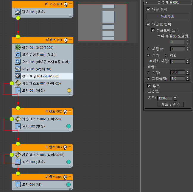이제 정적 재질 연산자를 이벤트 01에 추가하고 선택한 다음 재질 편집기(첫 번째 슬롯)에서 인스턴스(기본 모드)로 다중/하위 오브젝트 재질을 할당하고 정적 재질 매개변수를 조정하여 하위 재질을 순환합니다. 이벤트 맵은 다음과 같습니다.