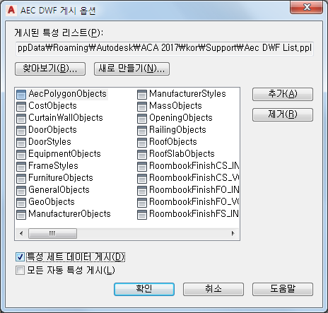 13. 내보낸 DWF 또는 DWFx 파일에서 특성 세트 정의를 제거하려면 해당 정의를 선택하고 제거를 클릭합니다.
