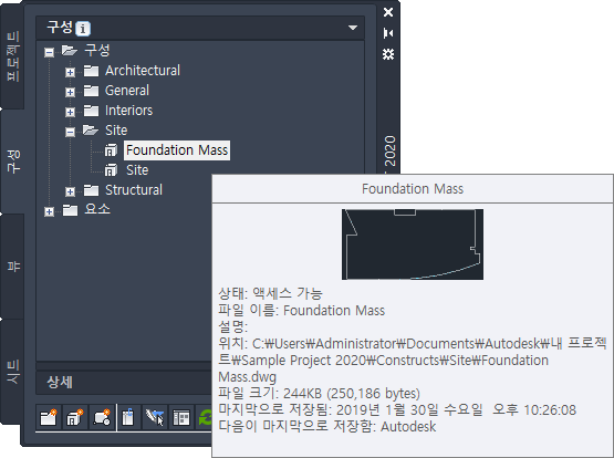 프로젝트 네비게이터에서는 프로젝트 도면의 썸네일 미리보기를 표시할 수 있습니다. 미리보기는 그래픽이나 상세 정보 또는 이 두 가지의 조합일 수 있습니다. 여러 도면이 있는 큰 프로젝트를 탐색하는 경우 썸네일을 표시하면 유용할 수 있습니다.