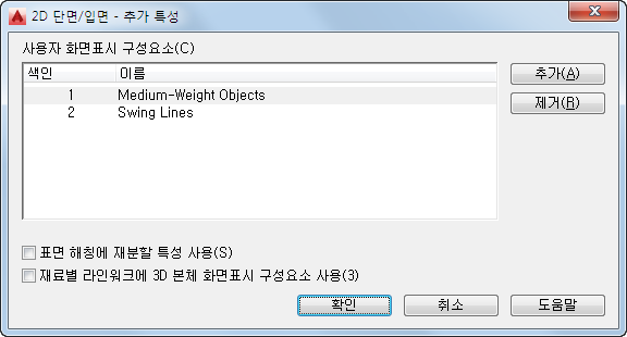 - 추가하는 구성요소에 대해 화면표시 특성을 지정하려면 도면층/색상/선종류 탭을 클릭하고 구성요소를 선택한 후 열 값을 필요에 따라 변경합니다.