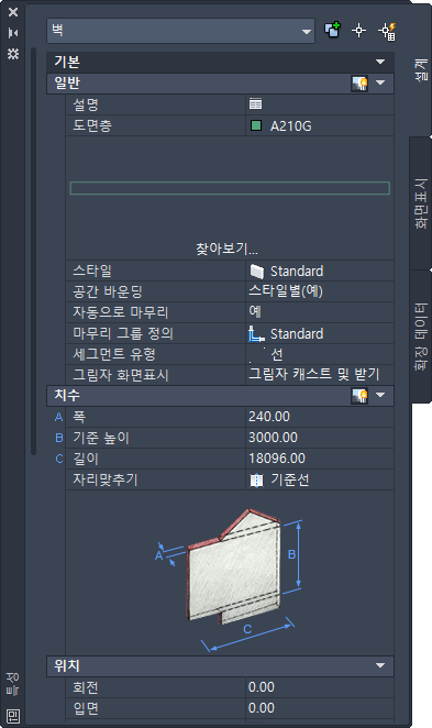 특성 팔레트는 객체의 물리적 특성과 그래픽 특성을 보고 수정할 수 있는 중앙 위치를 제공합니다. 여기서 객체는 그리려는 객체이거나 도면 영역에서 선택한 기존 객체일 수 있습니다. 또한 특성 팔레트의 확장 데이터 탭을 사용하여 분류, 주, 참조 문서, 하이퍼링크 및 특성 세트 데이터와 같은 기타 정보를 객체에 부착할 수 있습니다. AutoCAD Architecture toolset 세션 중 일반적으로 특성 팔레트를 계속 열어 둡니다.