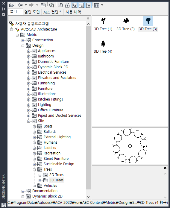 뷰 탭의 팔레트 패널 드롭다운에서 DesignCenter를 열고 AEC 컨텐츠 탭을 클릭하면 왼쪽 창에 루트 노드가 AutoCAD Architecture toolset인 사용자 응용프로그램 트리 뷰가 표시됩니다. 루트 노드 아래의 영국식 및 미터법 폴더 내에 CSI MasterFormat 2004 부속건물에 가까운 범주의 폴더가 있습니다. 트리 뷰의 가장 낮은 레벨에서 각 폴더가 하나 이상의 외부 도면 파일을 가리키며, 이러한 각 파일에는 하나의 AEC 컨텐츠가 들어 있습니다. DesignCenter 창 맨 위에 있는 을(를) 클릭하여 트리 뷰의 켜기/끄기를 전환할 수 있습니다.