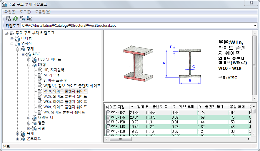 대부분의 표준 빔, 버팀기둥 및 기둥에 대한 스타일을 작성하려면 AutoCAD Architecture toolset에 포함된 주요 구조 부재 카탈로그를 사용할 수 있습니다. 카탈로그에는 Windows® 탐색기 모양의 트리 뷰로 구성된 업계 표준의 콘크리트, 강재 및 목재 구조 쉐이프가 있습니다. 카탈로그를 찾아보고 쉐이프를 선택한 후 스타일을 작성할 수 있습니다.