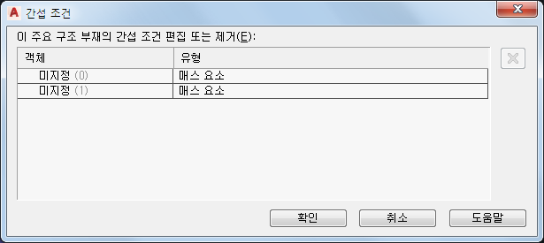 주: 또한 이 워크시트를 사용하여 객체 또는 유형 값에서 마우스 오른쪽 버튼을 클릭한 후 제거를 클릭하면 간섭 조건을 제거할 수 있습니다. 주요 구조 부재의 상황에 맞는 메뉴를 사용할 수도 있습니다. 간섭 조건을 제거하는 경우 주요 구조 부재와 간섭 조건을 작성하는 데 사용된 객체 사이의 연관을 제거합니다. 객체 자체는 도면에서 제거되지 않습니다.