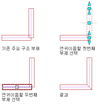 주: 특성 팔레트에서 자동 자르기의 값이 연결된 주요 구조 부재 각각에 대해 예인 경우 각 부재에 대한 모든 종류의 그립 편집으로 인해 두 부재 간에 연귀이음된 접합이 발생하게 됩니다.