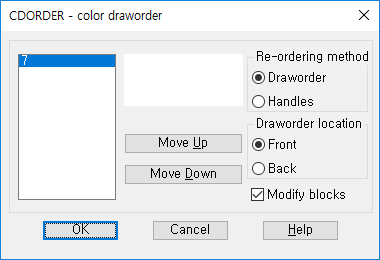 | Handles(사용되지 않음) | 도면 데이터베이스에서 객체를 재정리하여 선택한 객체의 그리기 순서를 정렬합니다. 객체가 삭제되고 해당 색상으로 지정되는 순서로 재작성됩니다. |