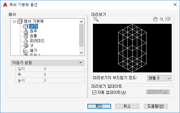 선택한 메쉬 기본체의 유형별로 각 변의 기본 분할 수를 설정합니다.