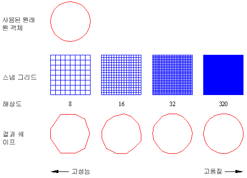 해상도 값이 크면 선택한 형상을 보다 정확하게 표현하는 쉐이프가 작성됩니다. 그러나 해상도 값이 크면 보다 많은 좌표 데이터가 포함된 쉐이프가 작성되므로 재생성 중에 AutoCAD의 처리 부담이 가중됩니다. 반면, 해상도 값이 작으면 정확도는 낮지만 AutoCAD에서 보다 빠르게 처리할 수 있는 쉐이프가 작성됩니다. 여러 해상도 값으로 테스트하여 성능과 정확도 간에 가장 만족스러운 균형점을 찾을 수 있습니다. 해상도 값은 가장 가까운 8의 배수로 반올림되며, 32,767을 초과할 수 없습니다. 다음 그림에서는 해상도 비율이 결과 쉐이프의 모양에 미치는 영향을 보여 줍니다.