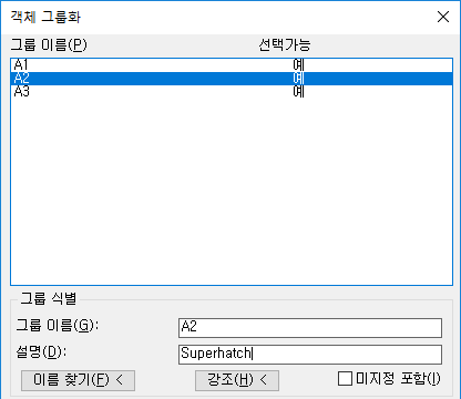 3) 그룹을 선택합니다. SUPERHATCH에 의해 작성된 그룹의 설명 필드에는 "superhatch"가 표시됩니다.