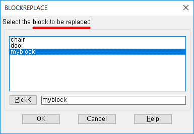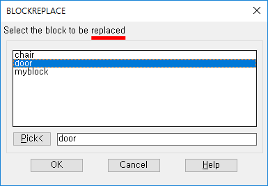 리스트에서 블록 이름을 선택하거나 선택 버튼을 클릭하고 도면에서 블록을 선택하여 검색할 블록 이름을 지정합니다.