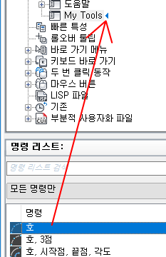 4. 명령 리스트 창에서 명령을 풀다운 메뉴 또는 <파일 이름>의 사용자화 창에 있는 풀다운 메뉴 아래의 위치로 끕니다.