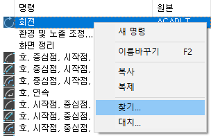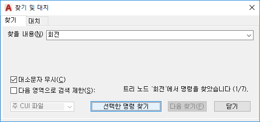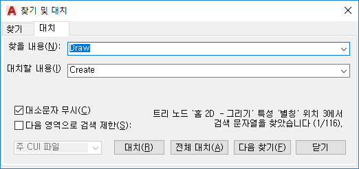 명령의 위치에 대해 상세히 설명하는 메시지가 표시됩니다. 즉, 사용자화 또는 특성 창에서의 정확한 위치 및 명령을 찾은 횟수가 표시됩니다.