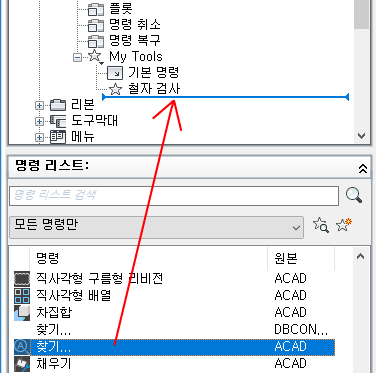 - 드롭다운 메뉴에 추가할 명령 또는 컨트롤을 명령 리스트 창에서 <파일 이름>의 사용자화 창으로 끕니다.