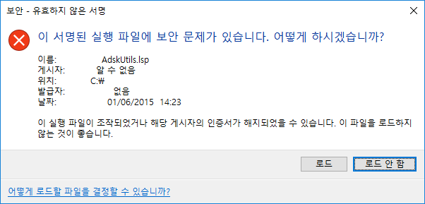 디지털 서명된 사용자 프로그램 파일을 로드할 때 AutoCAD 기반 프로그램은 파일에 부착된 디지털 서명을 확인합니다. 디지털 서명을 확인할 수 있었는지 여부에 대한 메시지 상자가 표시됩니다. 이 메시지를 보고 사용자는 프로그램 파일을 도면 환경에 로드하거나 로드하지 않을 수 있습니다.