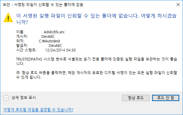 해결 방법: 예상대로 파일을 로드하여 사용합니다. 필요에 따라, 게시자가 서명한 모든 파일에 대해 앞으로 메시지 상자가 표시되지 않도록 게시자를 신뢰할 수도 있습니다.