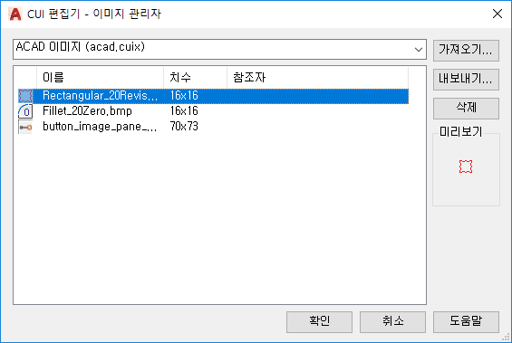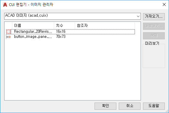 - 사용자화 탭에 있는 명령 리스트 창에서 아무 명령이나 선택하여 버튼 이미지 창을 표시합니다.