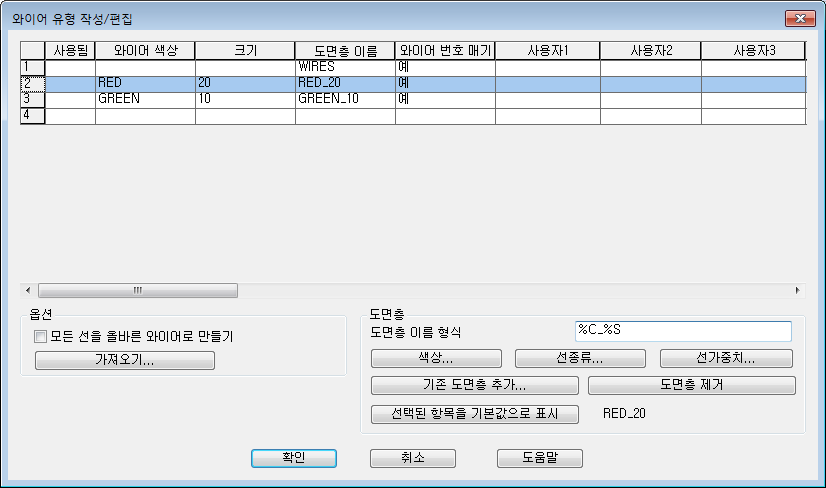 도면층 이름은 자동으로 작성됩니다. 작성하는 와이어 도면층 이름이 RED_20으로 지정됩니다.