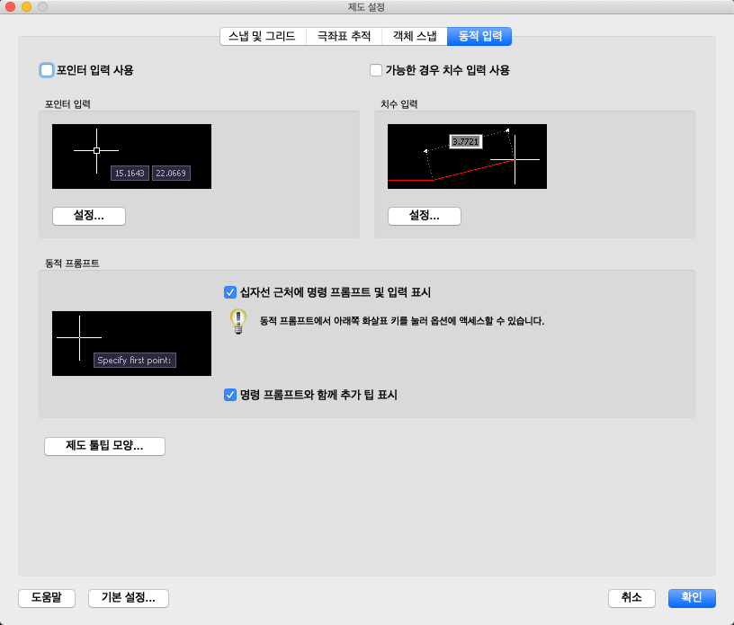 포인터 입력, 치수 입력, 동적 프롬프트 및 제도 툴팁의 모양을 조정합니다.