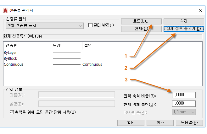 사용하려는 선종류를 로드하고 나면 특성 패널 또는 특성 팔레트에서 객체를 선택하고 선종류를 지정할 수 있습니다. 또는 도면층 특성 관리자에서 원하는 도면층에 대한 기본 선종류를 지정할 수 있습니다.