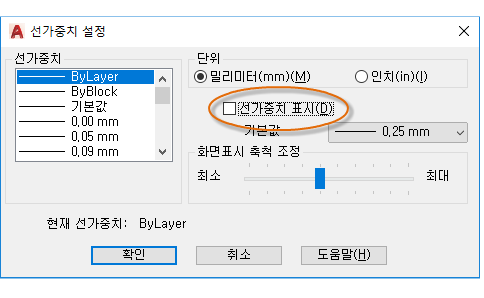 선가중치를 ByLayer로 설정한 상태로 두거나, 도면층의 선가중치를 재지정하는 값을 지정할 수 있습니다. 선가중치 미리보기가 동일하게 보이는 경우는 모니터에 대략적인 픽셀 폭으로 표시되기 때문입니다. 그러나 인쇄하면 올바른 두께로 인쇄됩니다.