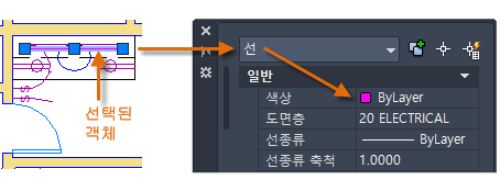 선택한 객체에 대한 현재 특성이 특성 팔레트에 표시됩니다. 이러한 특성의 설정을 클릭하고 변경하여 해당 특성을 변경할 수 있습니다. "ByLayer"로 설정된 특성은 해당 도면층의 설정을 상속합니다. 이전 예에서 20 ELECTRICAL 도면층에서 작성된 객체는 보라색인데 이는 보라색이 해당 도면층에서 객체의 기본 색상이기 때문입니다.