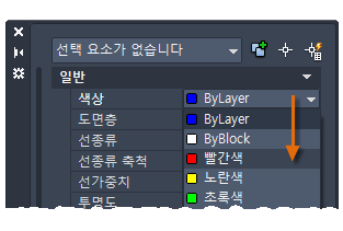 특성 팔레트에는 중요한 모든 특성 설정 리스트가 표시됩니다. 사용 가능한 모든 필드를 클릭하여 현재 설정을 변경할 수 있습니다. 다음 예에서는 선택한 객체가 없는 경우 현재 색상이 ByLayer에서 빨간색으로 변경됩니다. 그러면 이후에 작성된 모든 객체에는 빨간색 색상 특성이 지정됩니다.