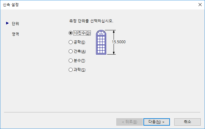 신속 설정 마법사에는 두 개의 페이지, 즉 단위와 면적이 있습니다. 신속 설정 마법사에서 작업할 때는, 뒤로와 다음을 선택하여 페이지 사이를 전환하고 마지막 페이지에서 마침을 선택하여 마법사를 닫은 다음 지정한 설정을 가진 새 도면을 작성합니다.
