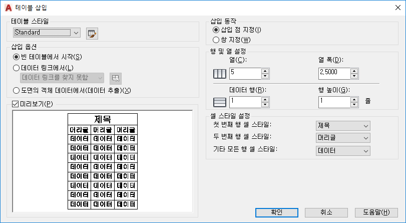 테이블의 크기와 위치를 지정합니다. 좌표 입력 장치를 사용하거나 명령 프롬프트에 좌표 값을 입력할 수 있습니다. 이 옵션을 선택한 경우, 열과 행 수 및 열 폭과 행 높이는 윈도우의 크기와 열 및 행 설정에 따라 달라집니다.