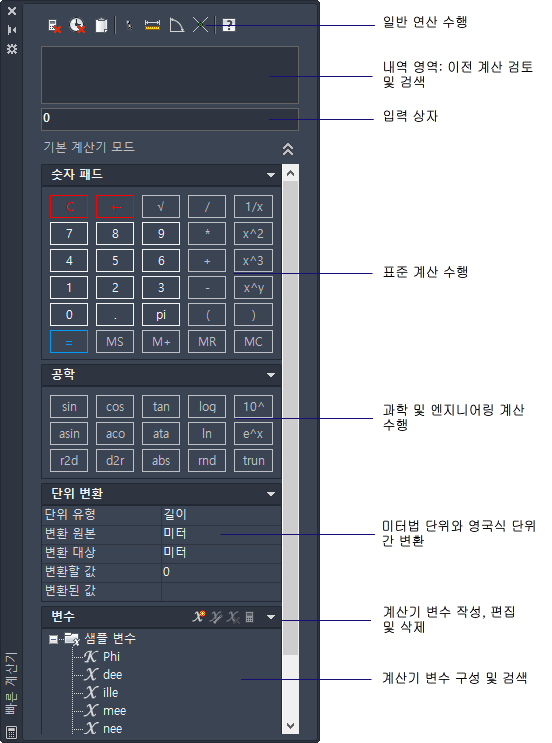 빠른 계산기에는 공학 계산기에서 제공되는 기본적인 기능 외에 기하학적 함수, 단위 변환 및 변수도 포함되어 있습니다.