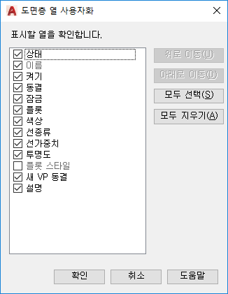 LAYER(명령) 찾기: 마우스 오른쪽 버튼으로 도면층 열 레이블 클릭 > 사용자화